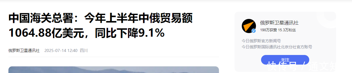 来源:中国海关总署:今年上半年中俄贸易额1064.88亿美元,同比下降9.1%